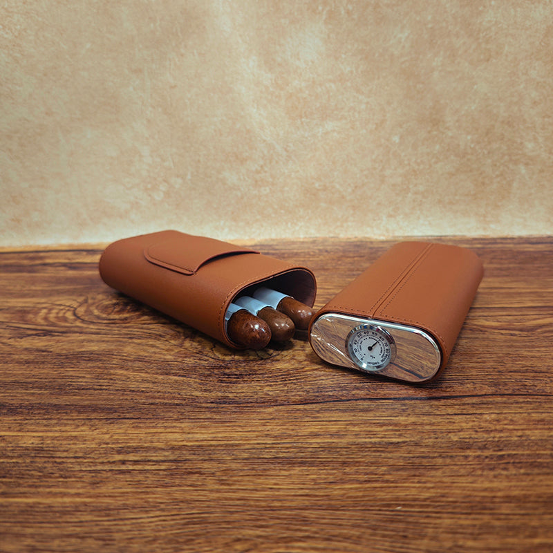 3-Cigar Genuine Leather Cigar Box with Top Hygrometer Display, Portable with Hygrometer Dial and Cedar Wood Lining